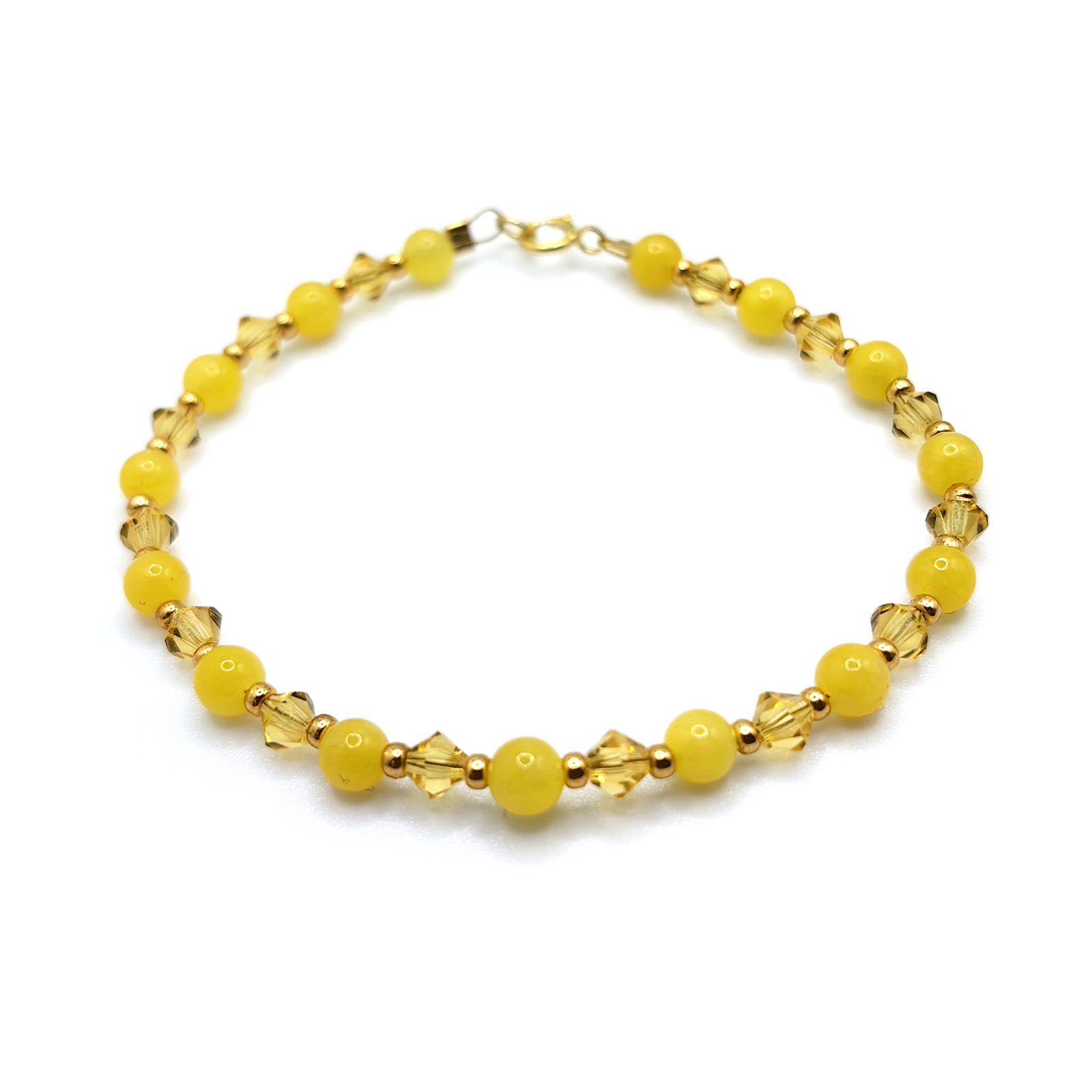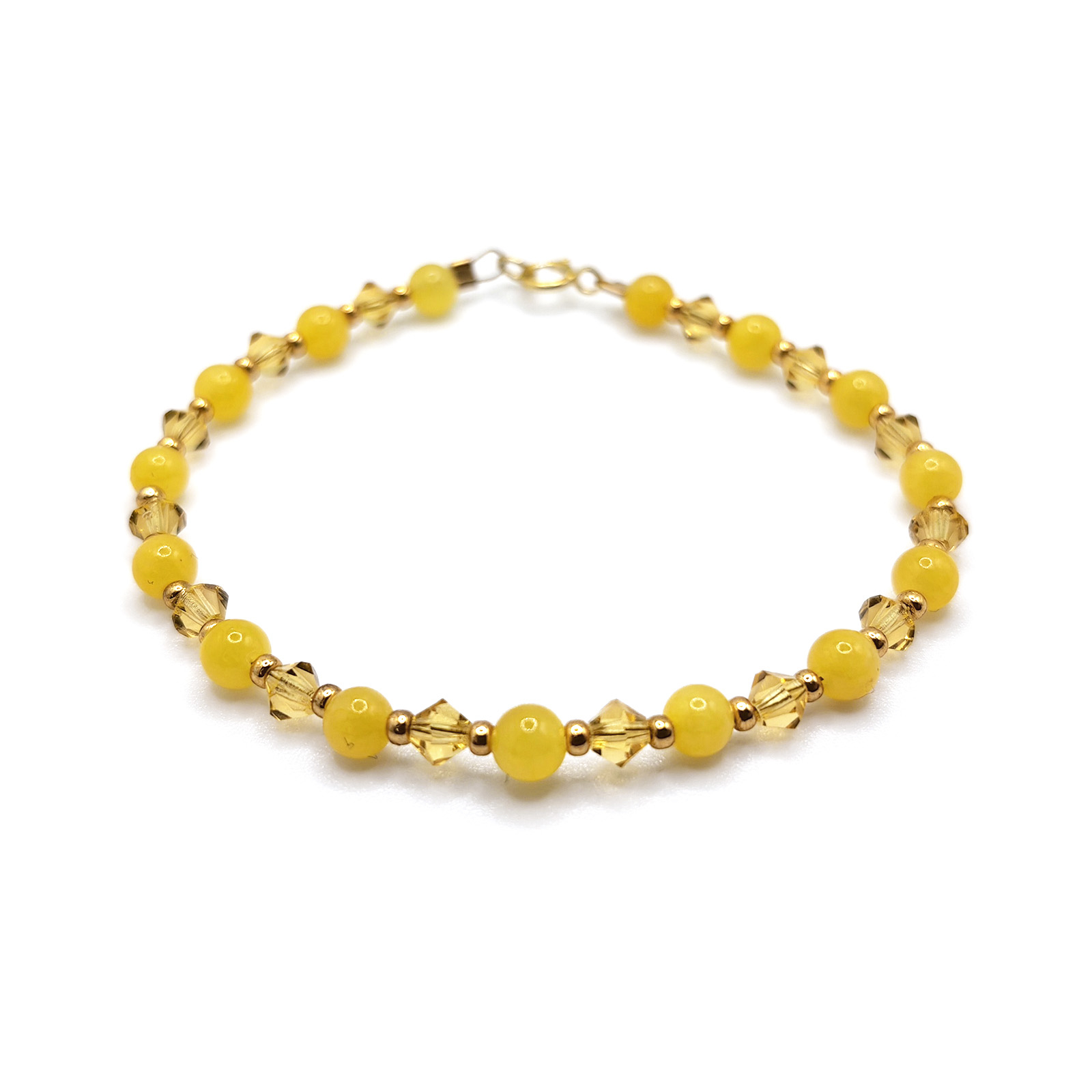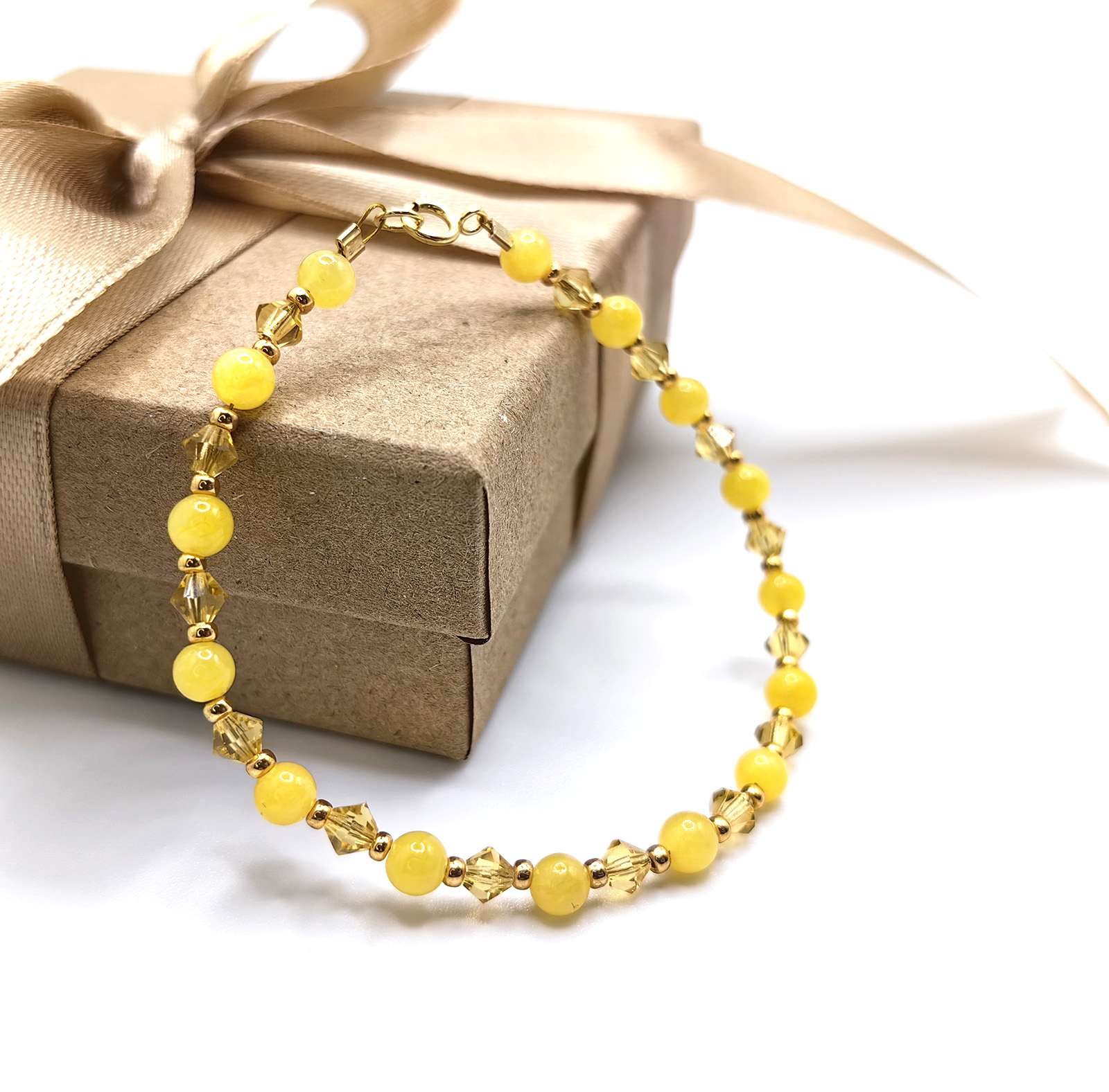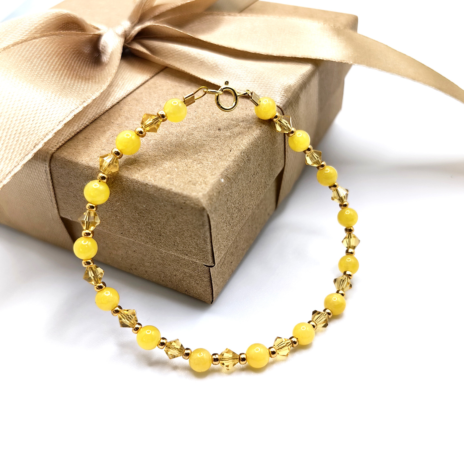 Gentle Glow este o bratara subtire si eleganta, realizata din jad galben natural si margele Miyuki din Japonia. Detaliile fine din Argint 925 placat cu Aur ii ofera un aspect cald si rafinat, perfect pentru femeile care iubesc bijuteriile delicate. Se asorteaza usor atat cu tinute casual, cat si elegante, adaugand o nota de luminozitate si feminitate oricarui look.