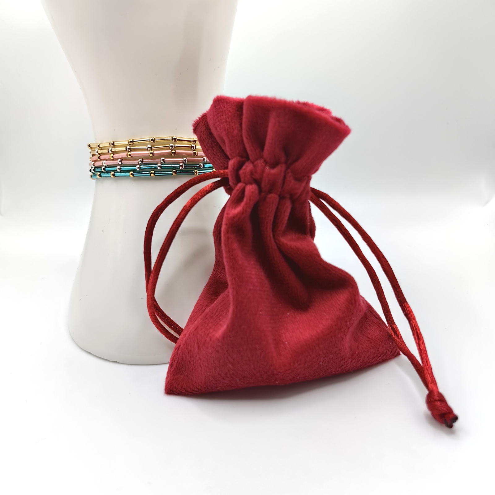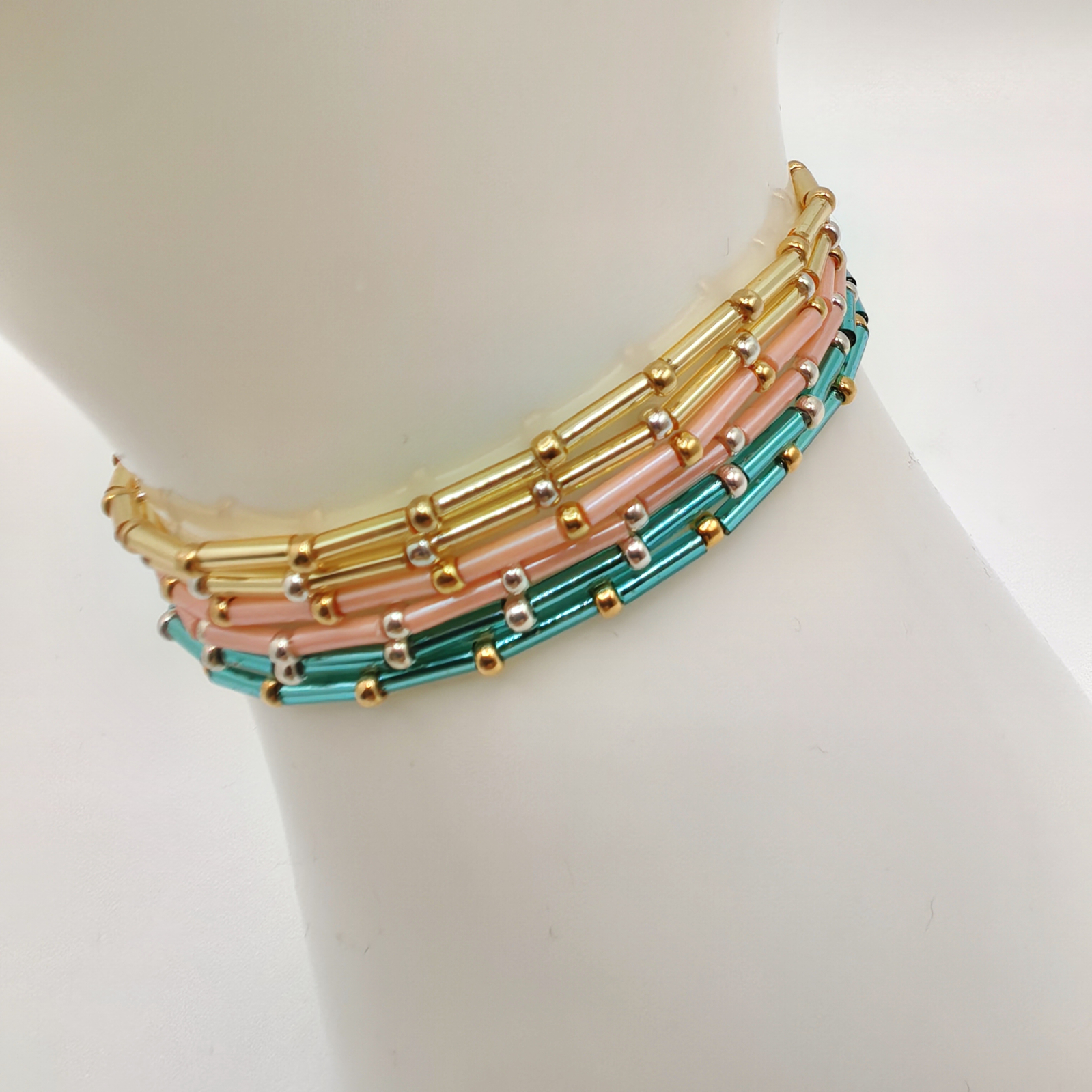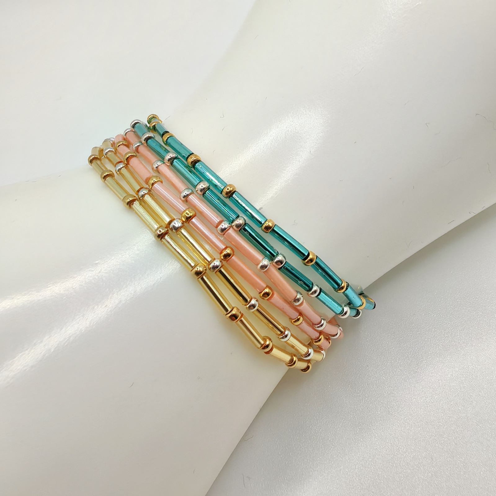 Materiale folosite: margele Miyuki din Japonia, margele Miyuki placate cu Aur 24K, margele Miyuki placate cu Argint 925, elastic rezistent. Bratarile sunt confectionate din margele delicate, cu o grosime de 2 mm, ceea ce le ofera un aspect fin si elegant.
