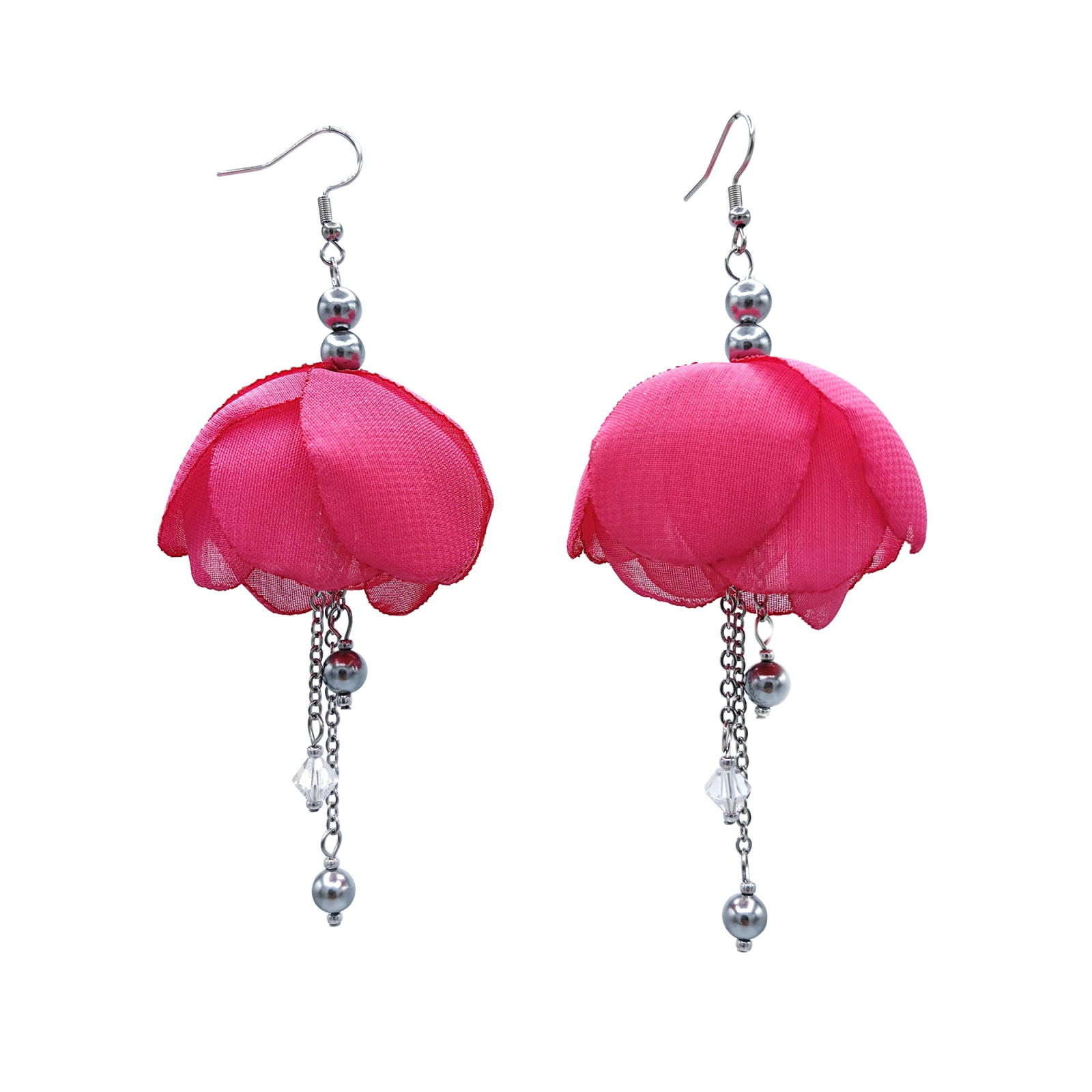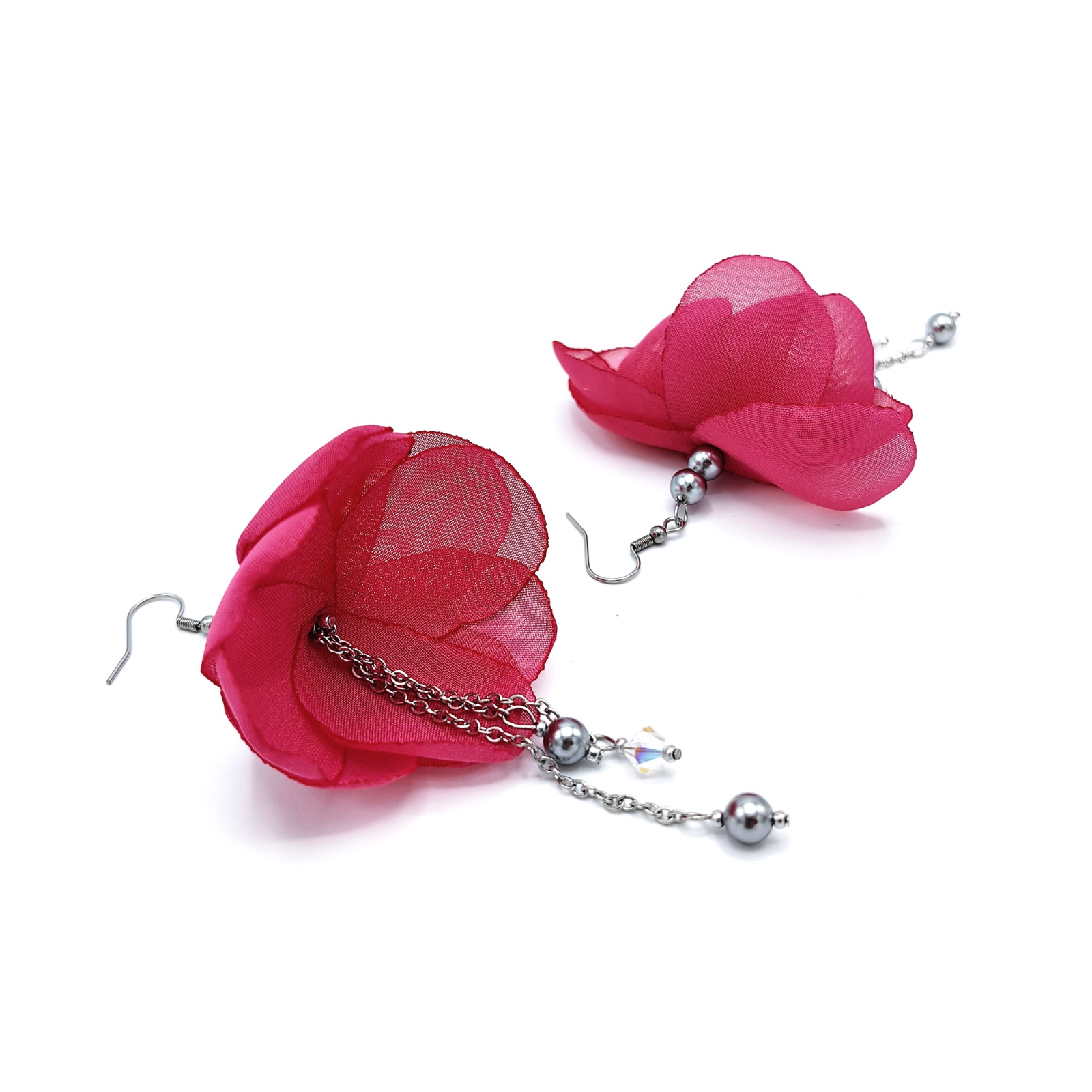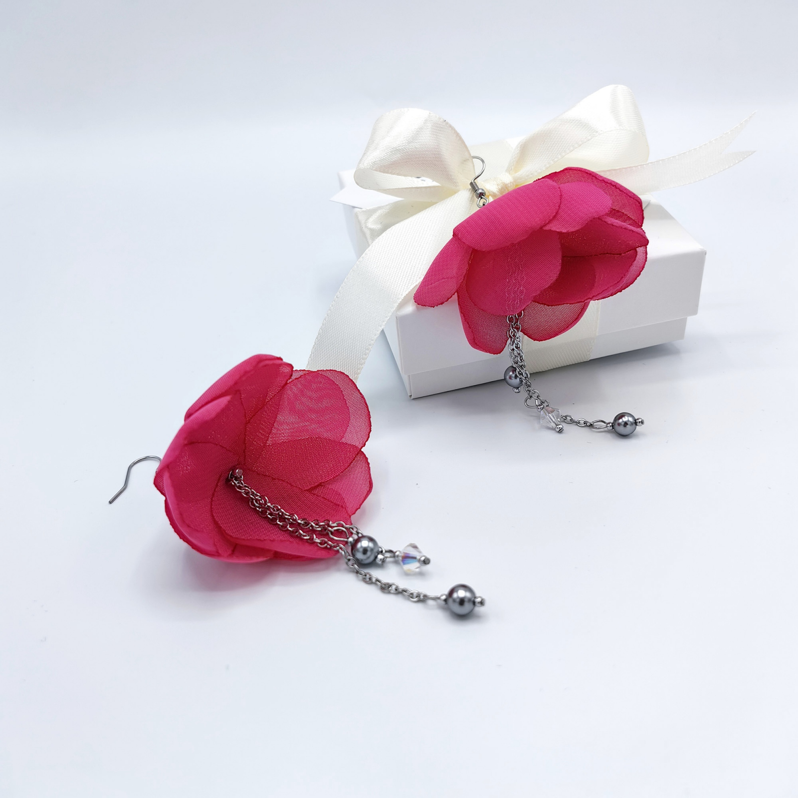 BALERINA - Cercei lungi cu flori din voal, perle, cristale si inox, culoarea roz fucsia