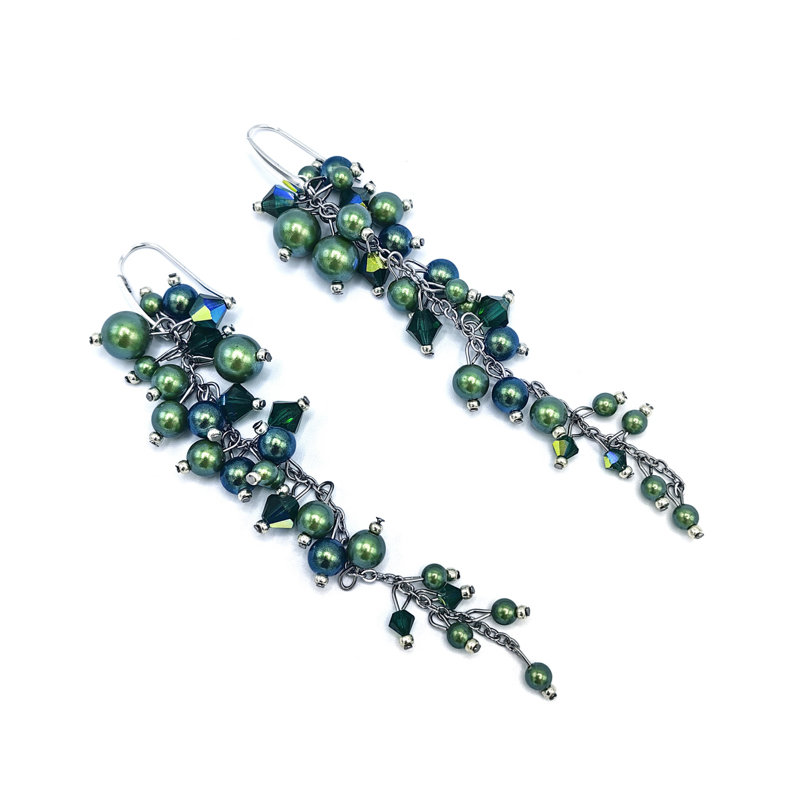 Materiale folosite: perle si cristale de calitate superioara (tip Mallorca, Preciosa), margele Miyuki din Japonia; ace, tortite si lant din otel inoxidabil 304.