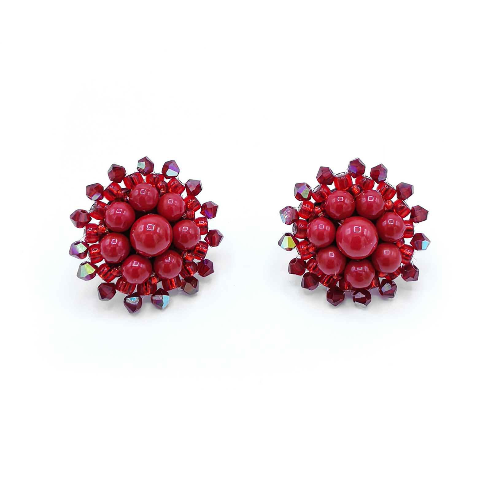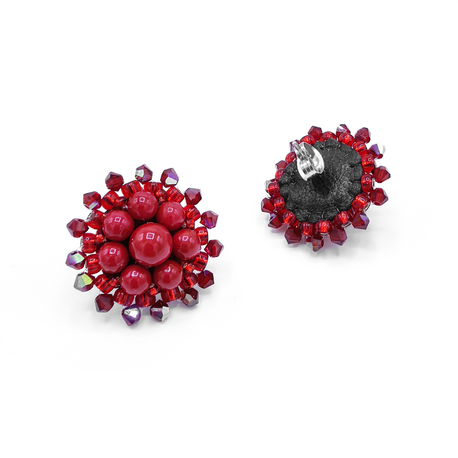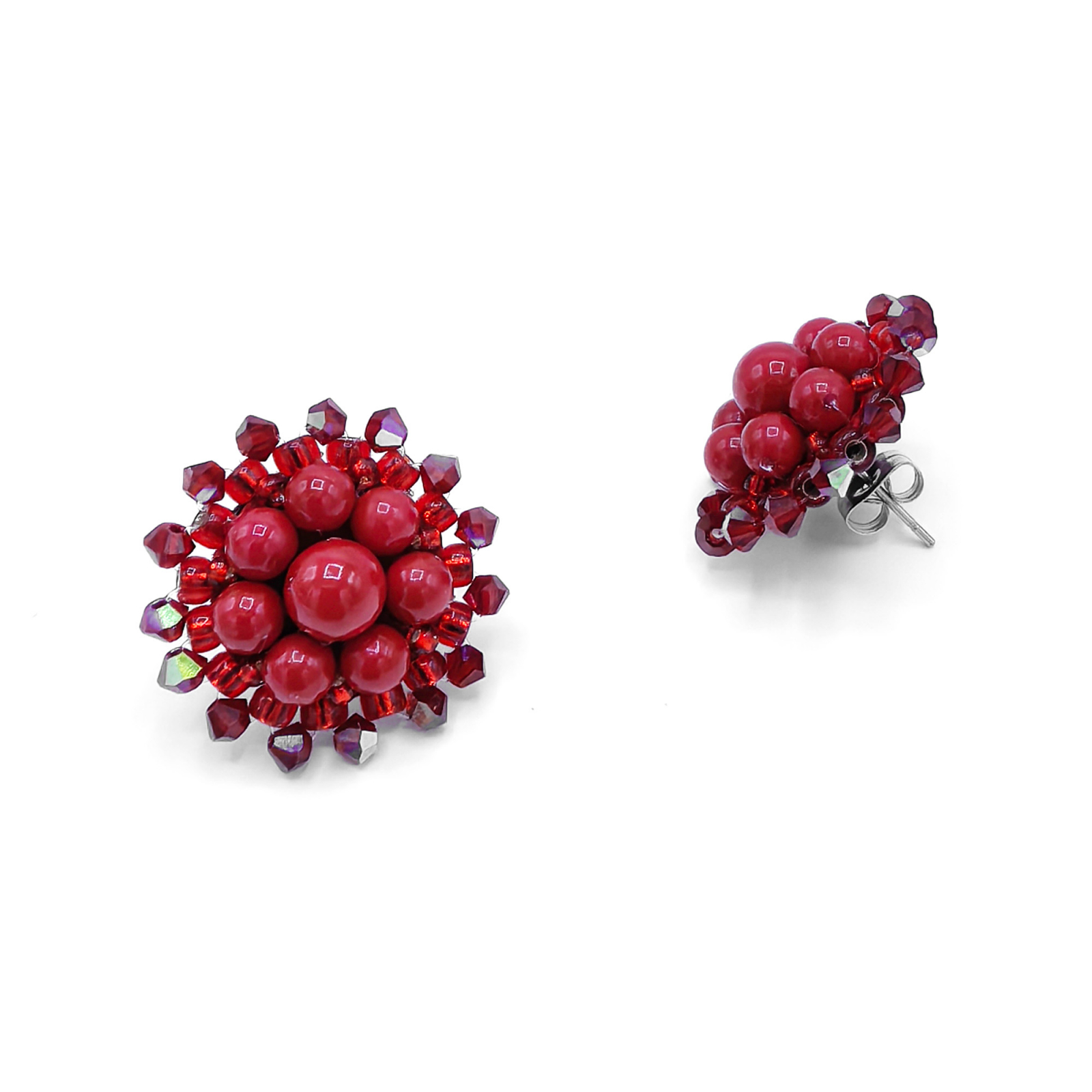 GRACE - Cercei eleganti rotunzi cu perle si cristale, ac si surub otel inoxidabil, culoarea rosu