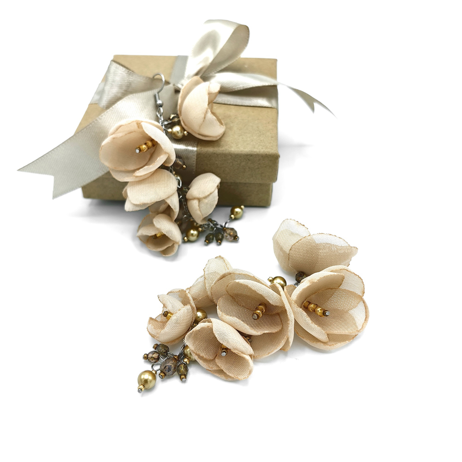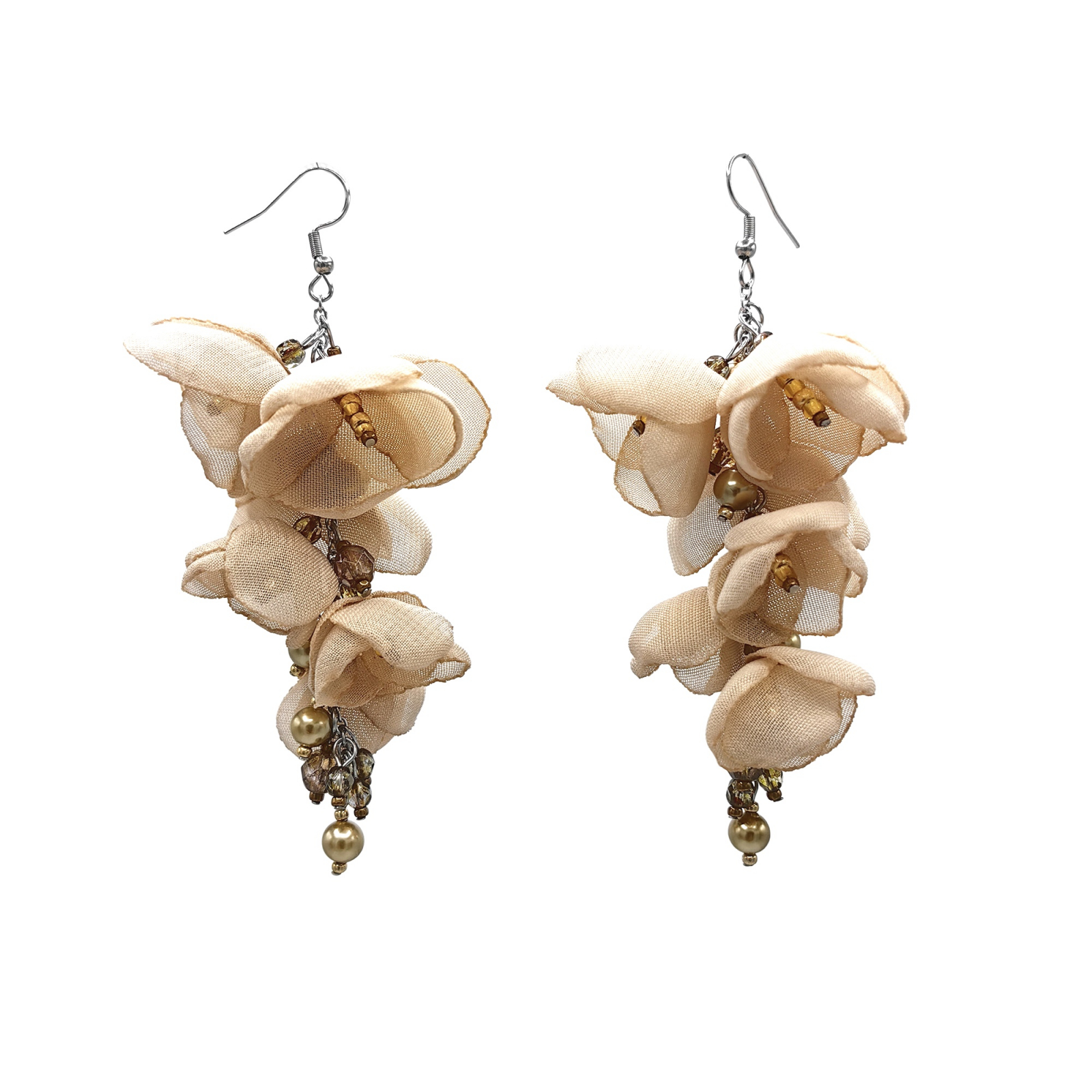 LATIN LOVE - Cercei lungi stil ciorchine cu flori din voal culoarea bej cu perle si cristale