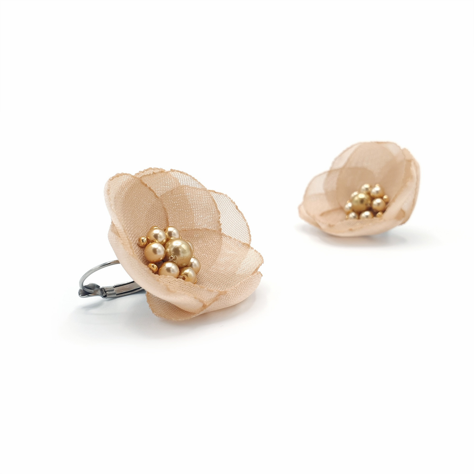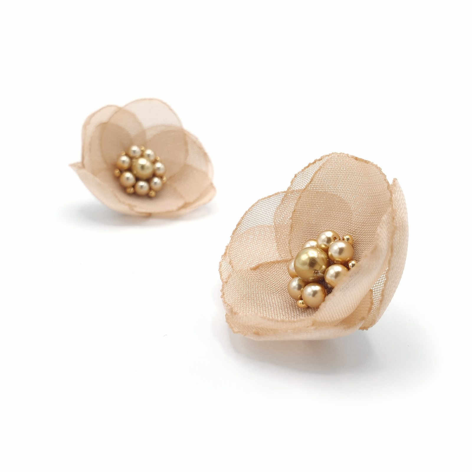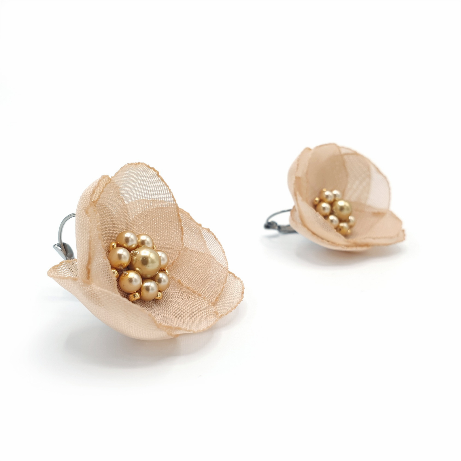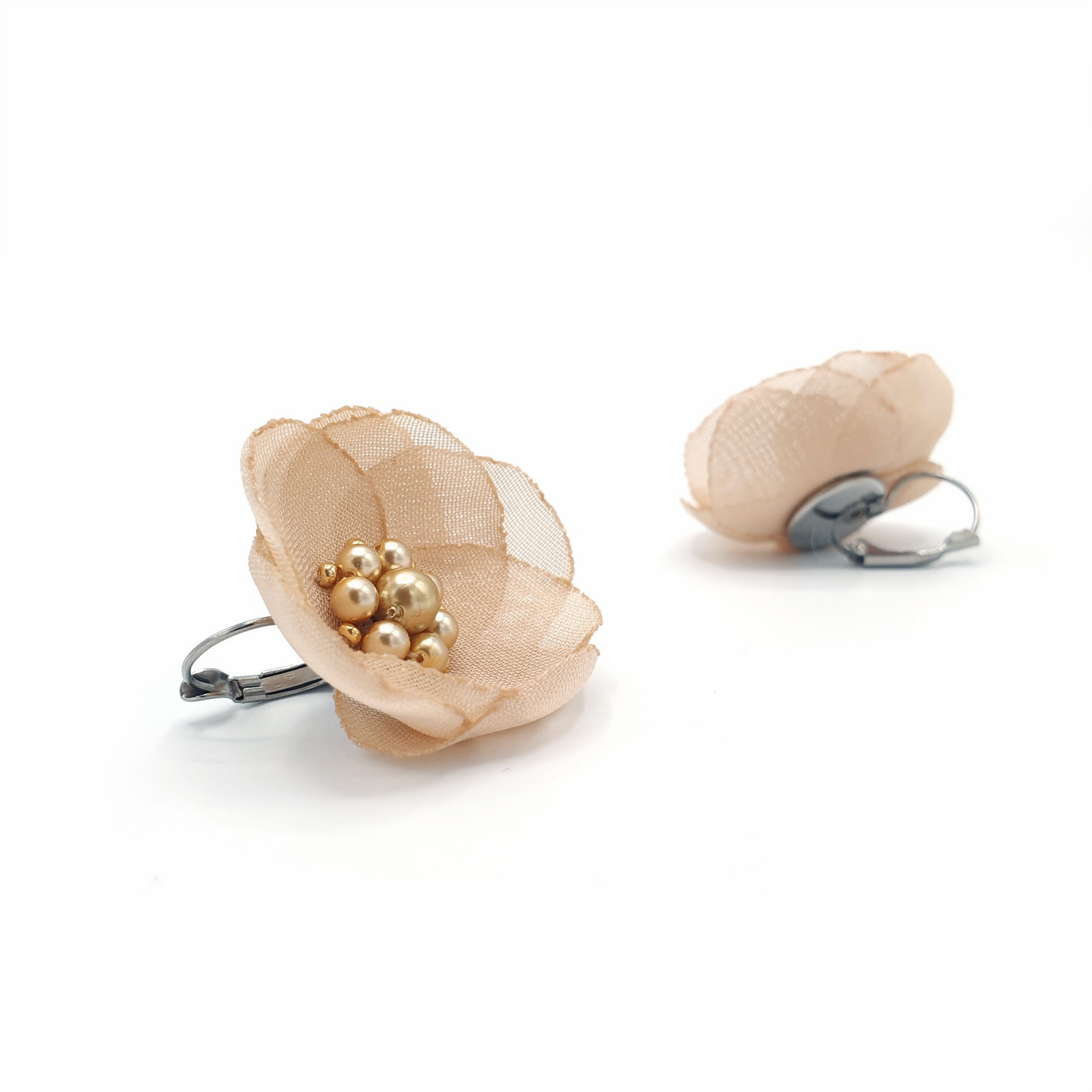 Mod de realizare: Fiecare pereche de cercei este realizata cu pasiune si atentie la fiecare detaliu. Floarea cerceilor este creata dintr-un voal fin, petalele acesteia fiind decupate manual. Apoi, fiecare petala este topita la lumanare pentru a evita degradarea materialului si a oferi florii un aspect cat mai natural. In centrul fiecarei flori stralucesc perle de calitate superioara, care adauga o nota subtila de lux si eleganta. Floarea este prinsa pe un suport din otel inoxidabil, pentru a-ti oferi o bijuterie frumoasa si durabila.