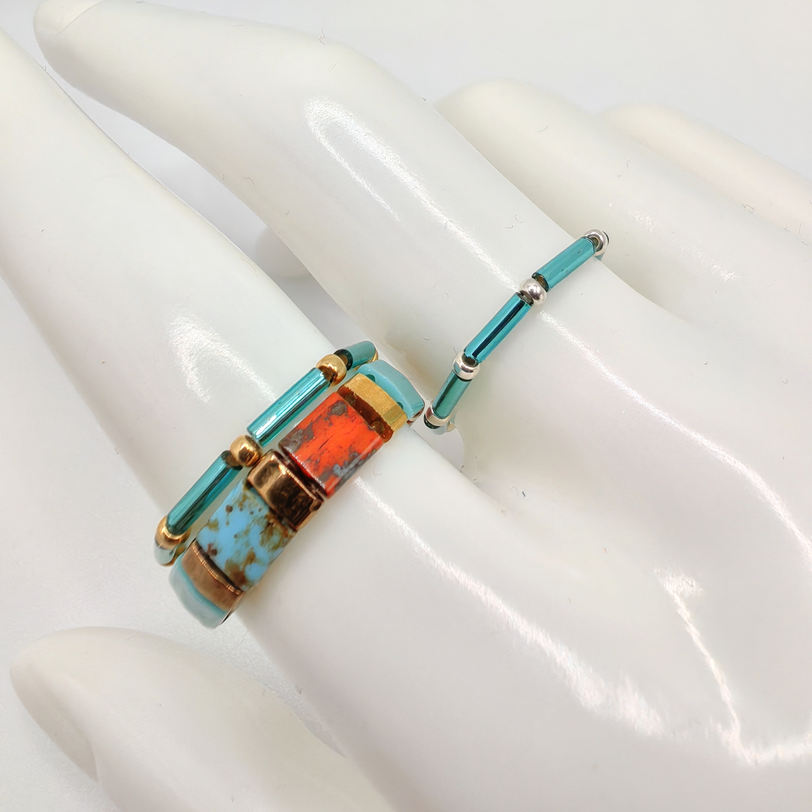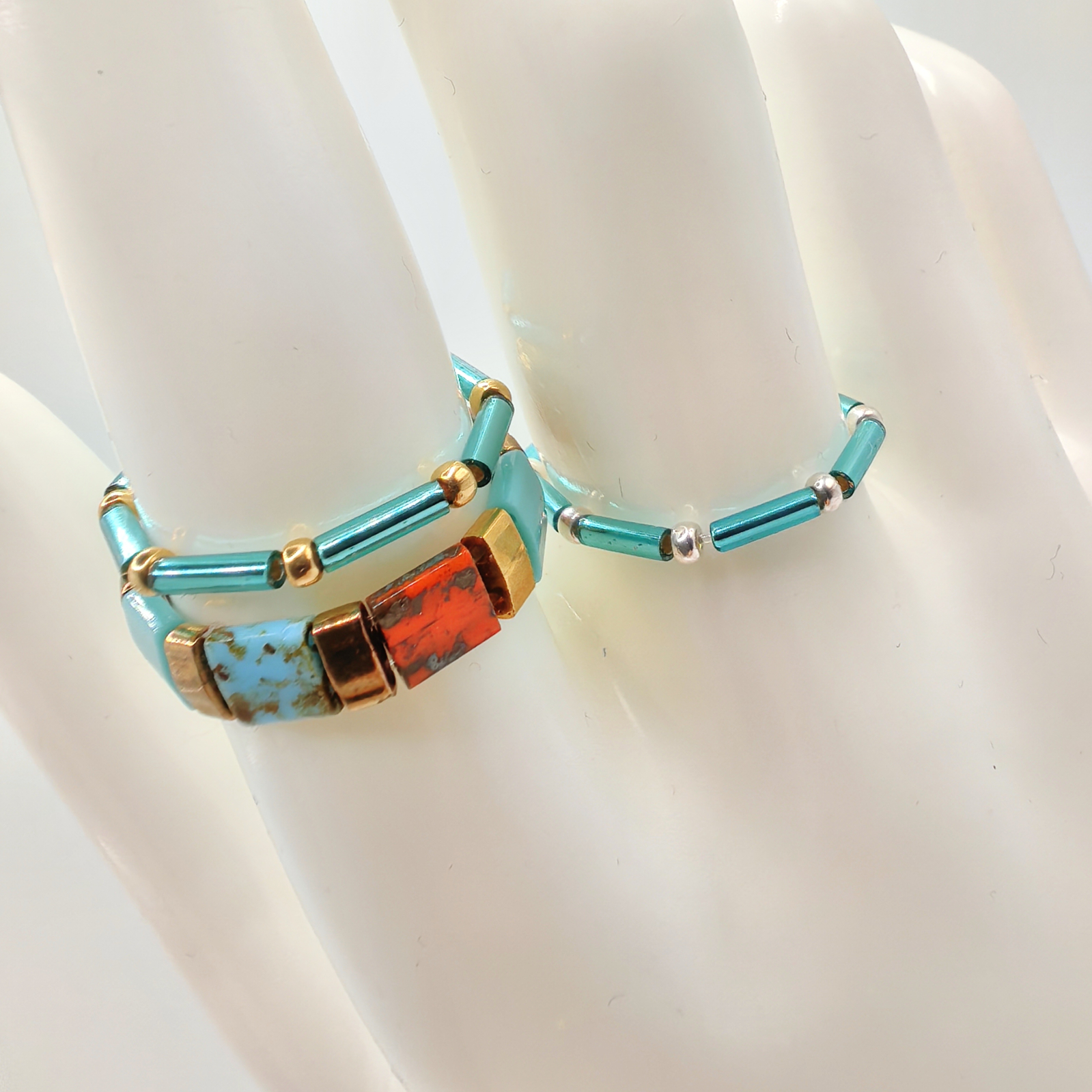 Materiale folosite: margele Miyuki din Japonia, margele Miyuki placate cu Aur 24K, margele Miyuki placate cu Argint 925, elastic rezistent. Inelele sunt confectionate din margele delicate, cu dimensiuni intre 2 si 4 mm, ceea ce le ofera un aspect fin si elegant.