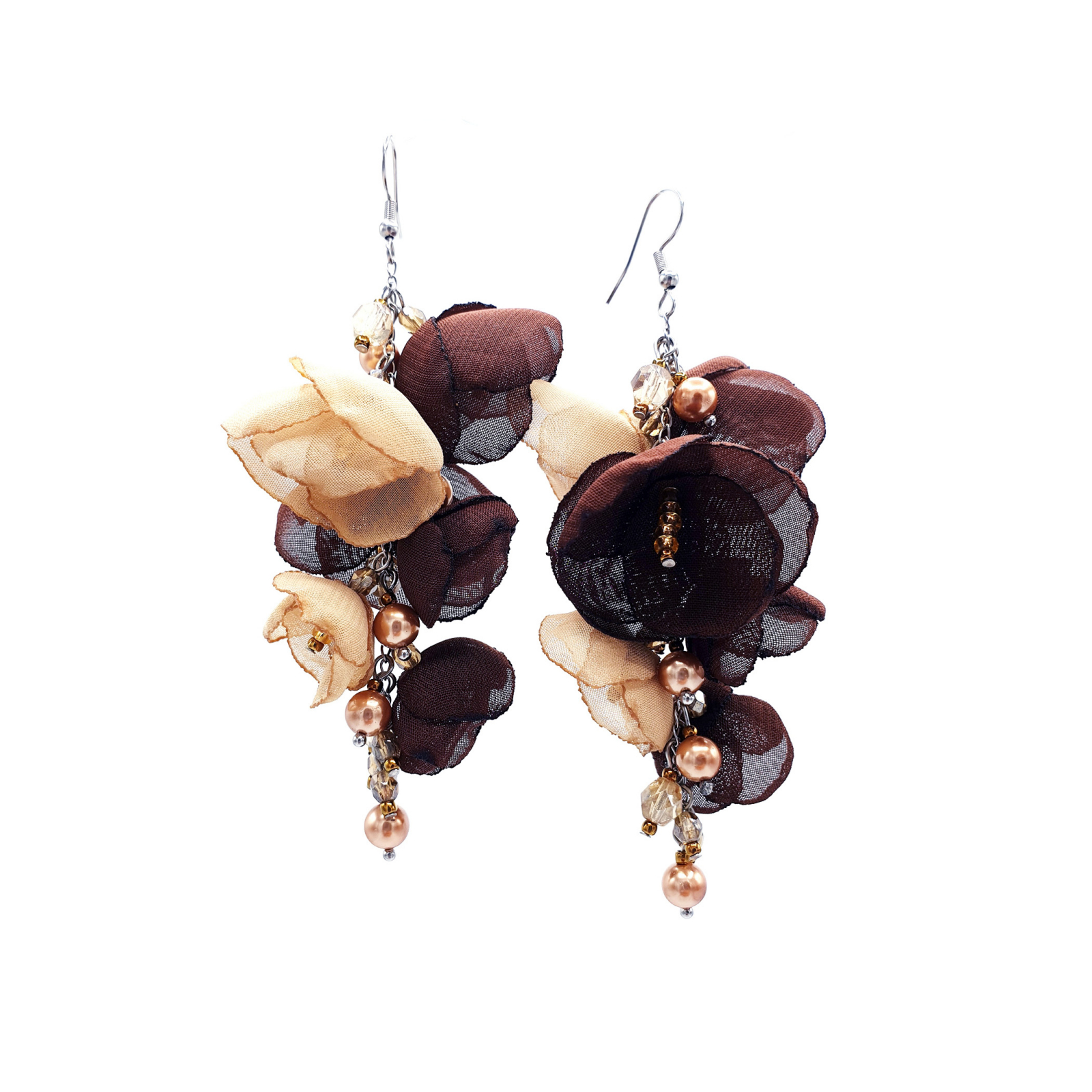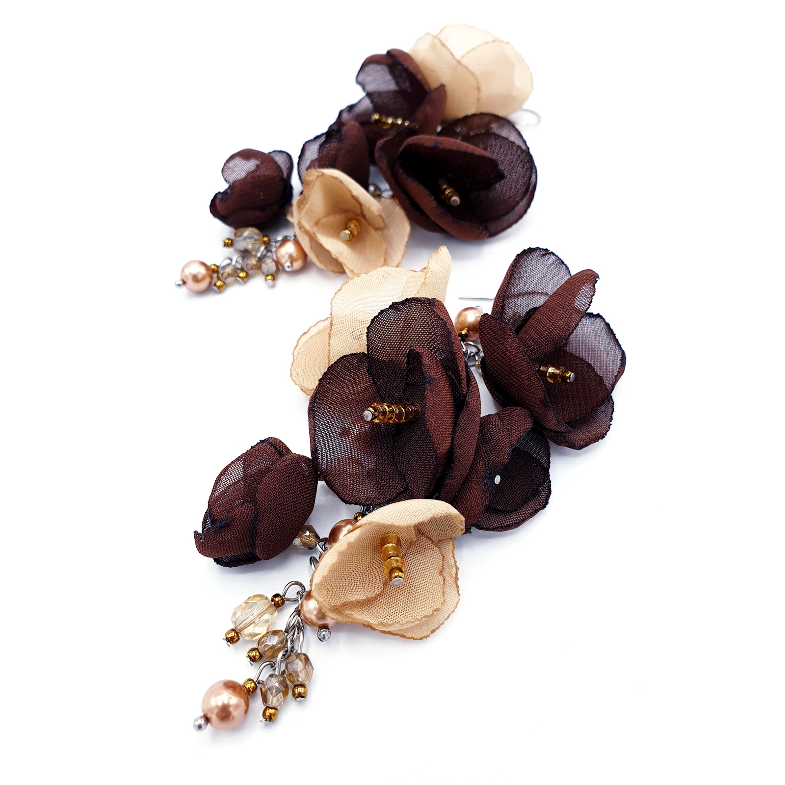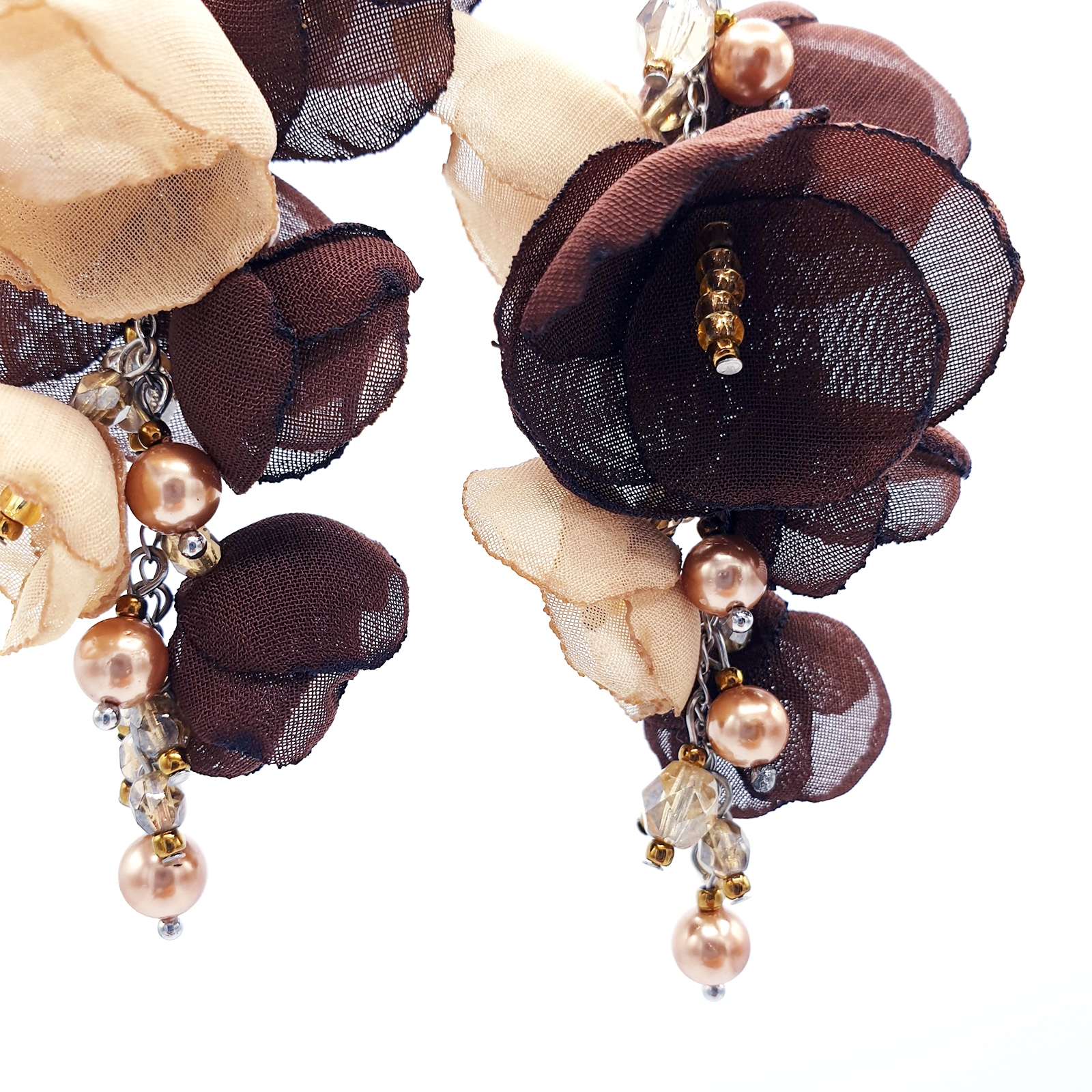 LATIN LOVE - Cercei lungi stil ciorchine cu flori din voal culoarea maro cu bej cu perle si cristale aurii