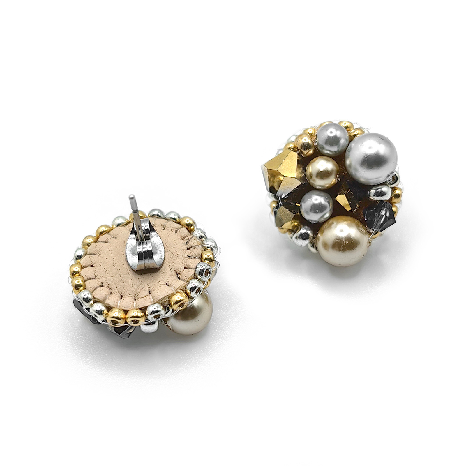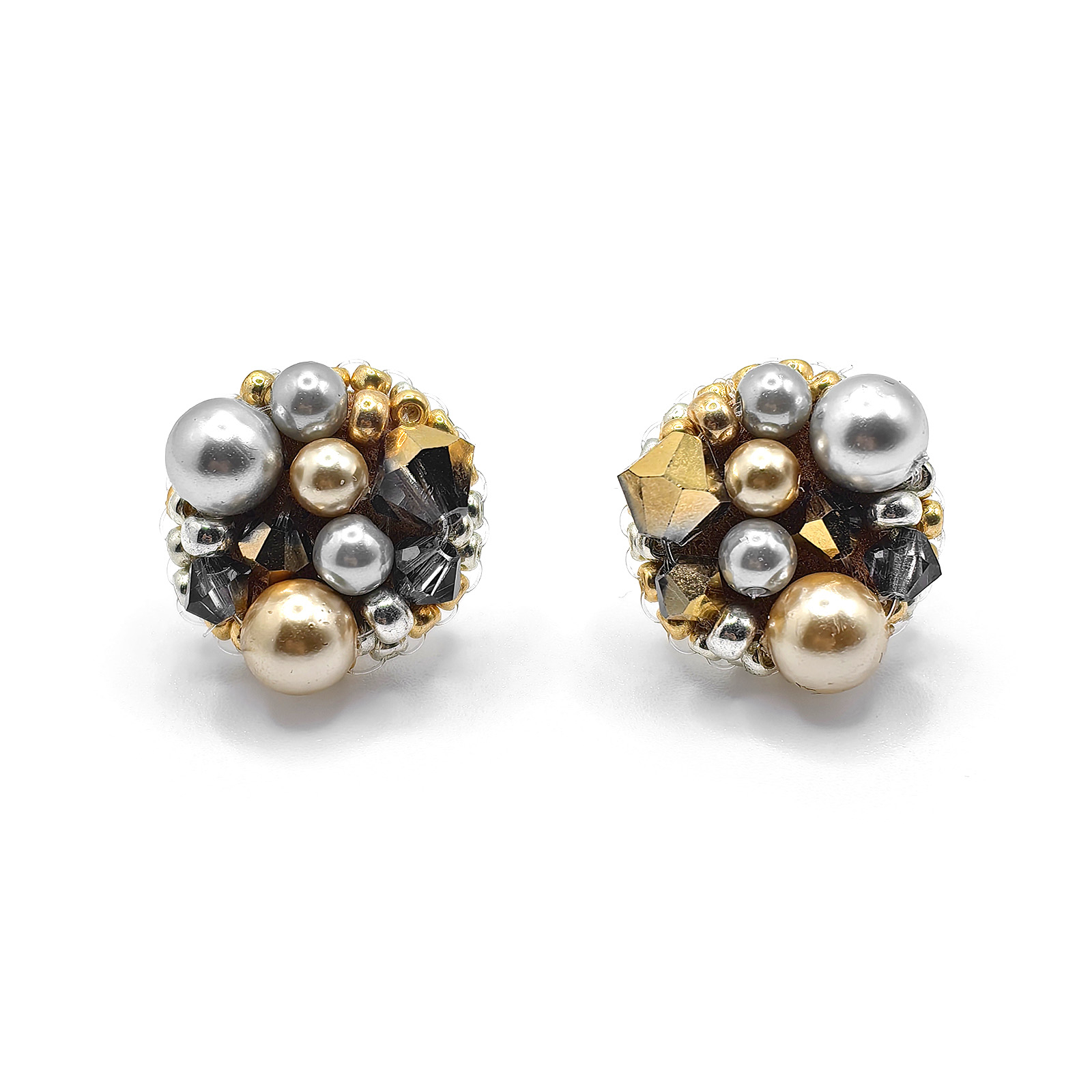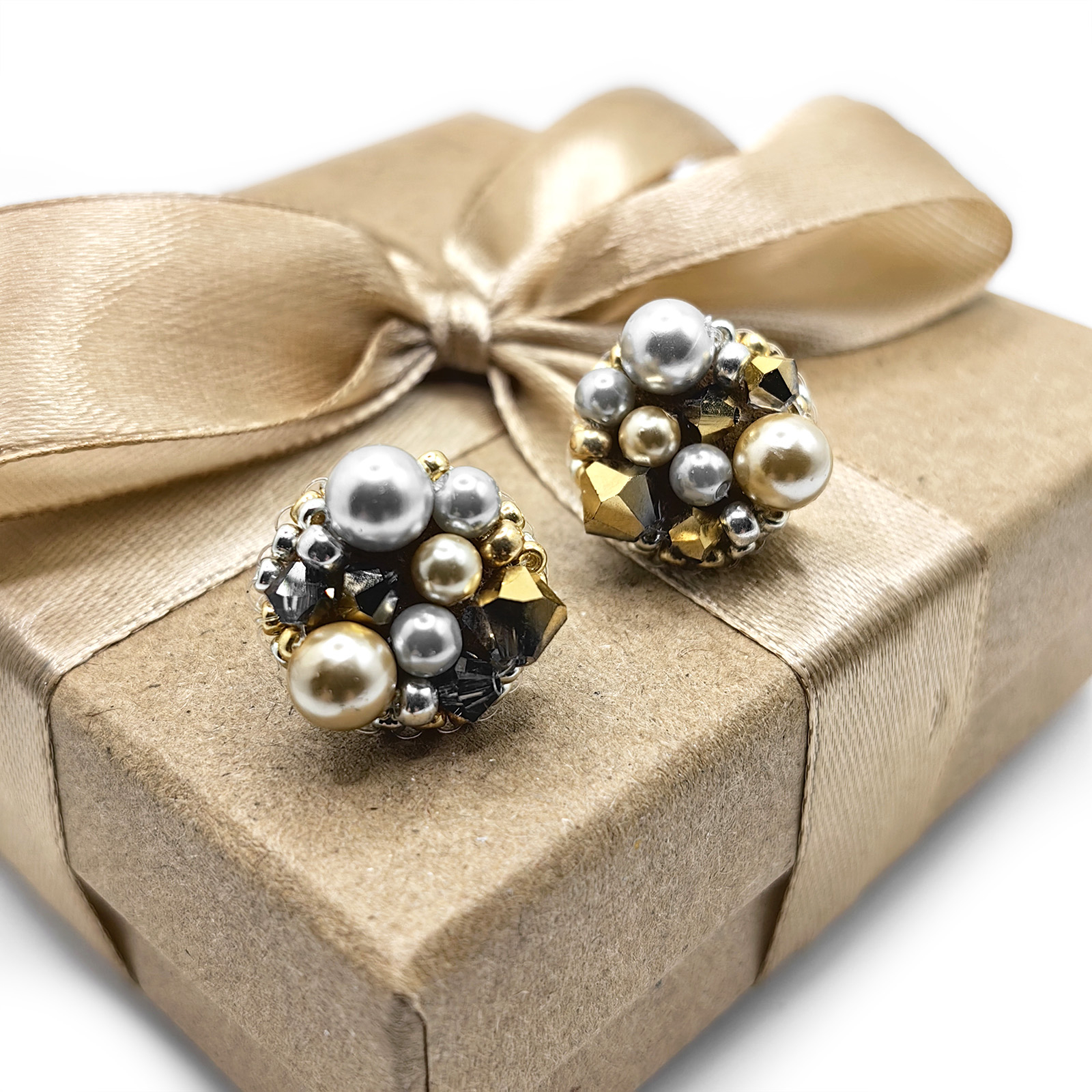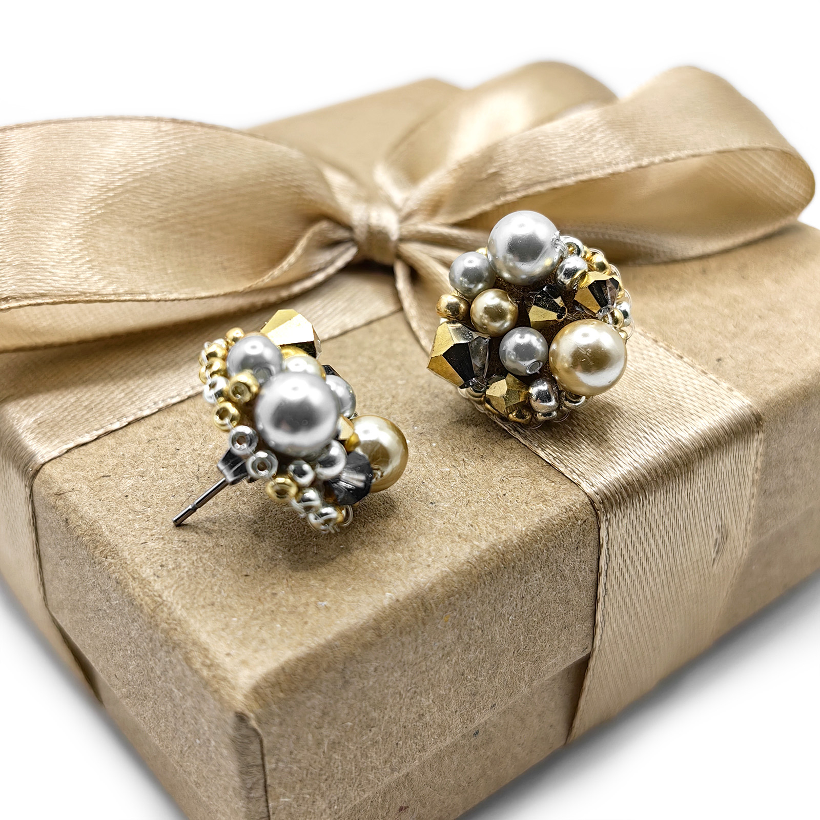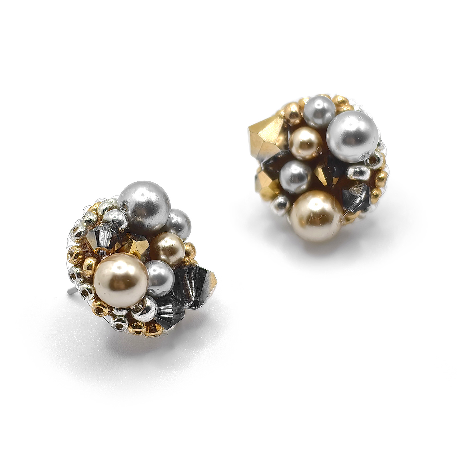 Crystal Glow sunt cercei eleganti realizati manual, cu perle si cristale aurii si argintii, care adauga o nota subtila de lumina oricarei tinute.