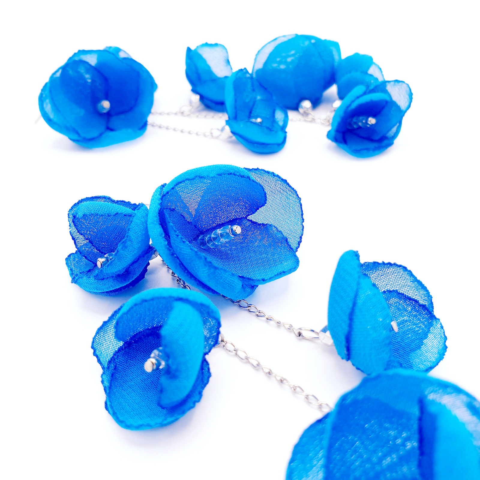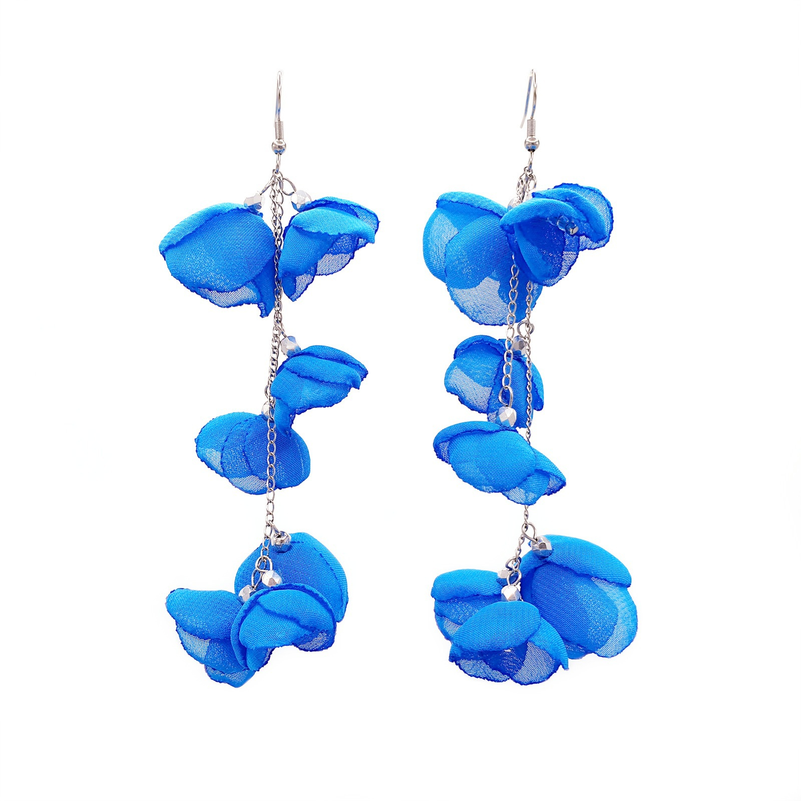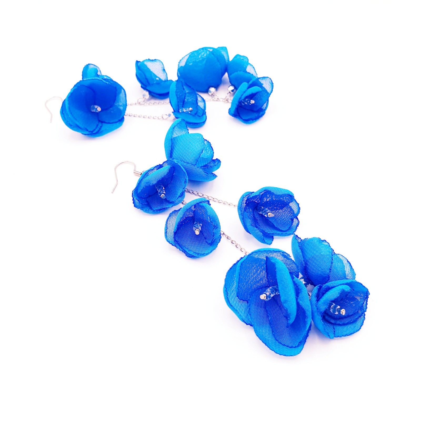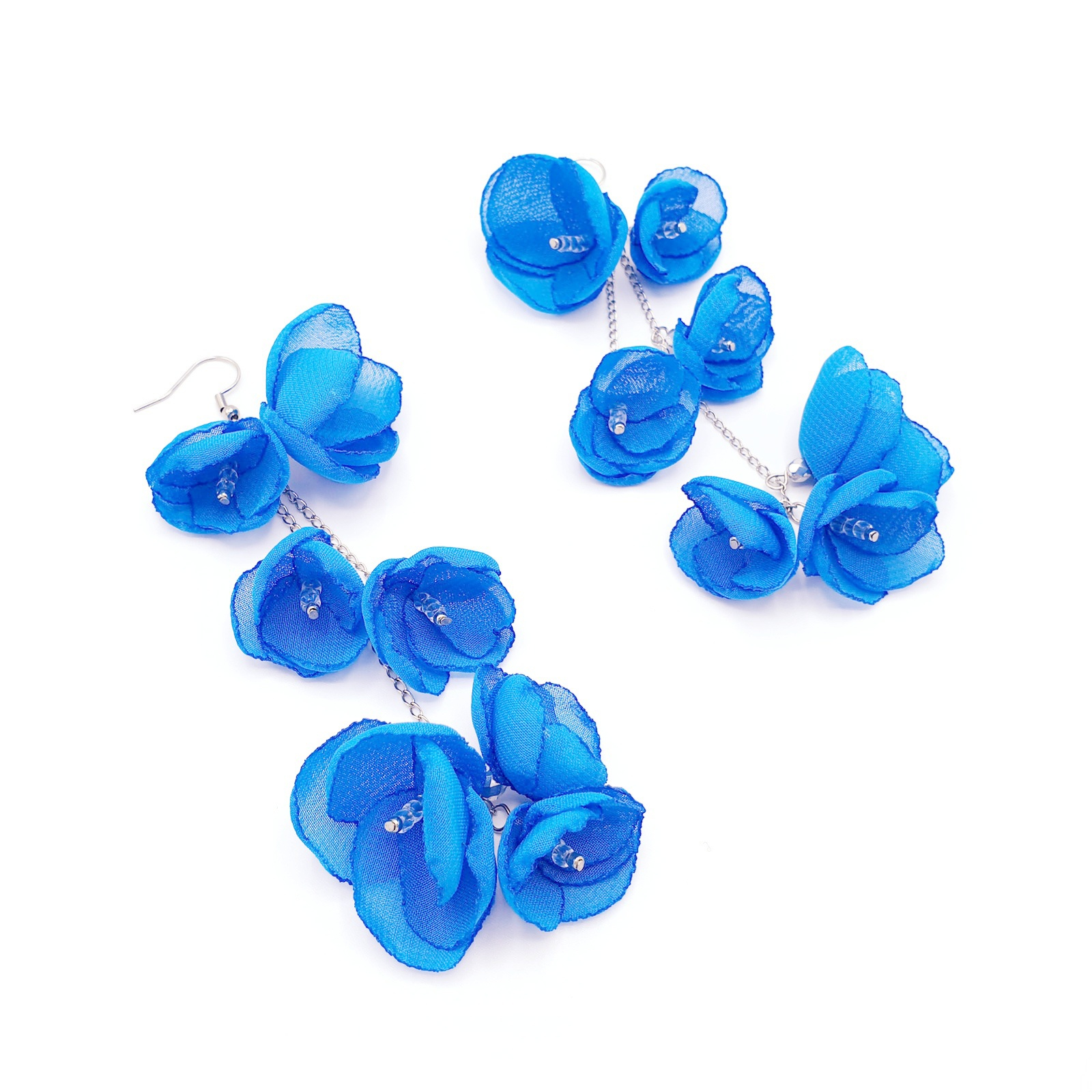 SPRING BLOOM - Cercei foarte lungi cu flori din voal, culoarea albastru, 11 cm, otel inoxidabil