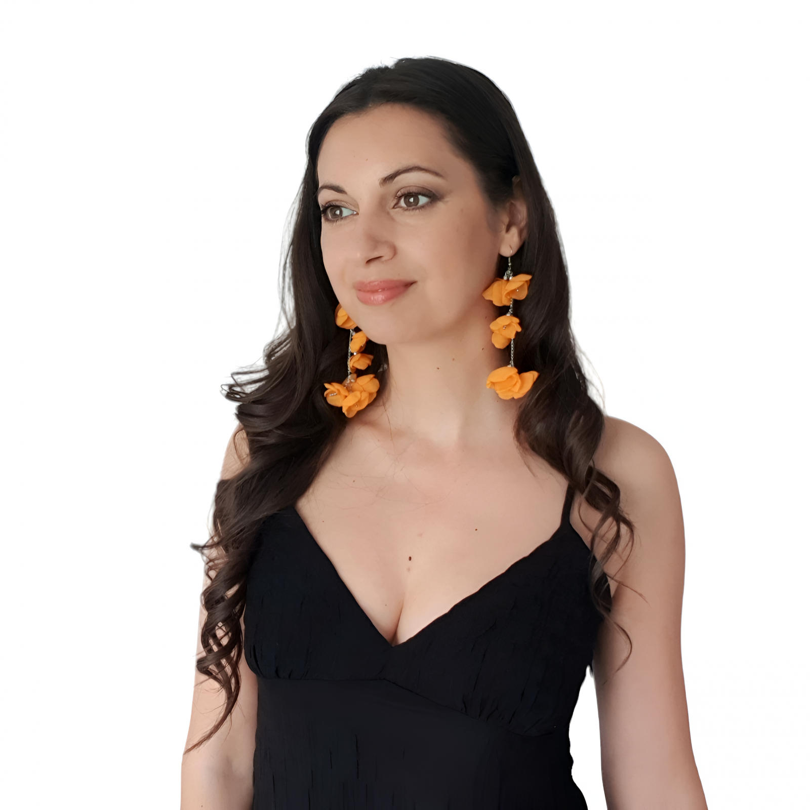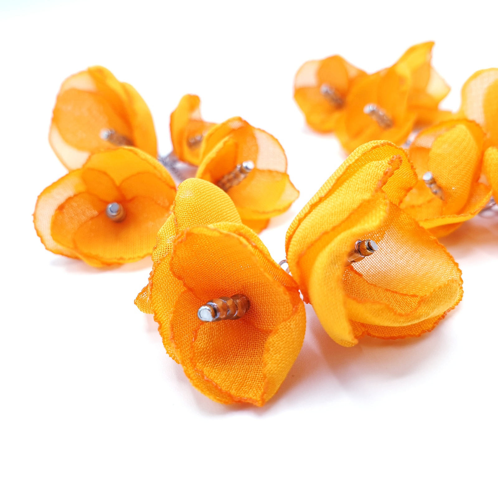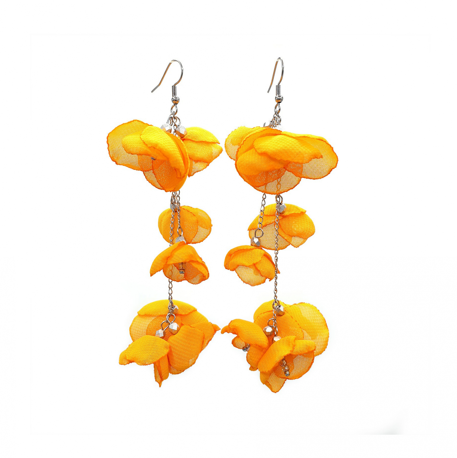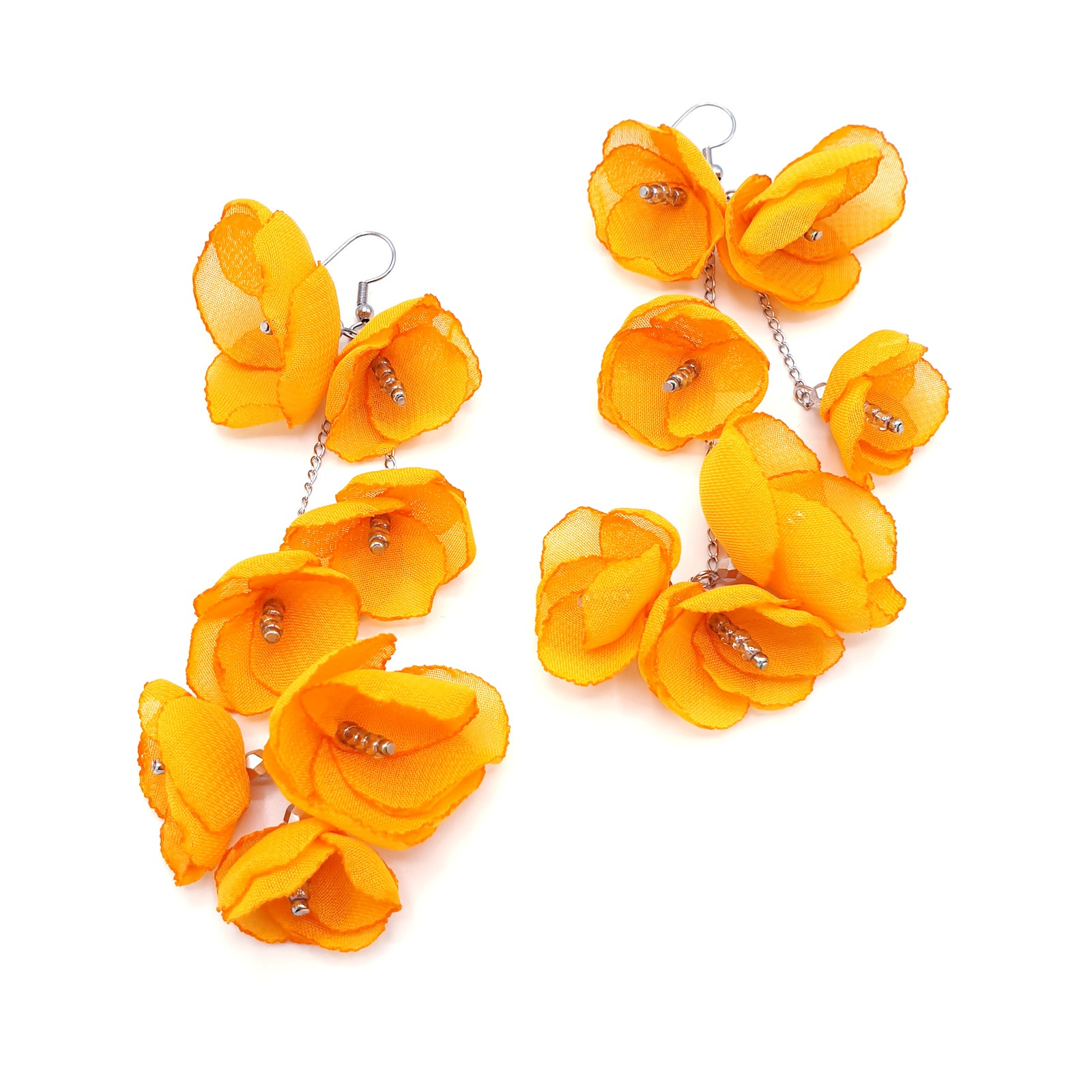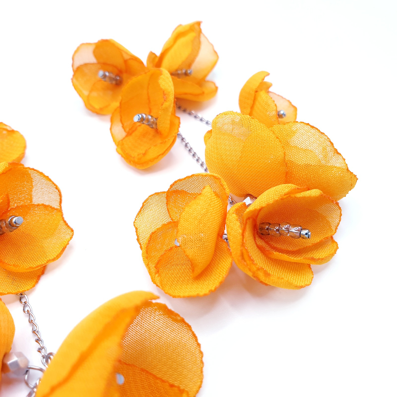 SPRING BLOOM - Cercei foarte lungi cu flori din voal, culoarea portocaliu, 11 cm, inox